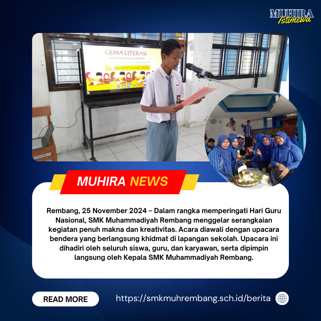 Rembang, 25 November 2024 – Dalam rangka memperingati Hari Guru Nasional, SMK Muhammadiyah Rembang menggelar serangkaian kegiatan penuh makna da...