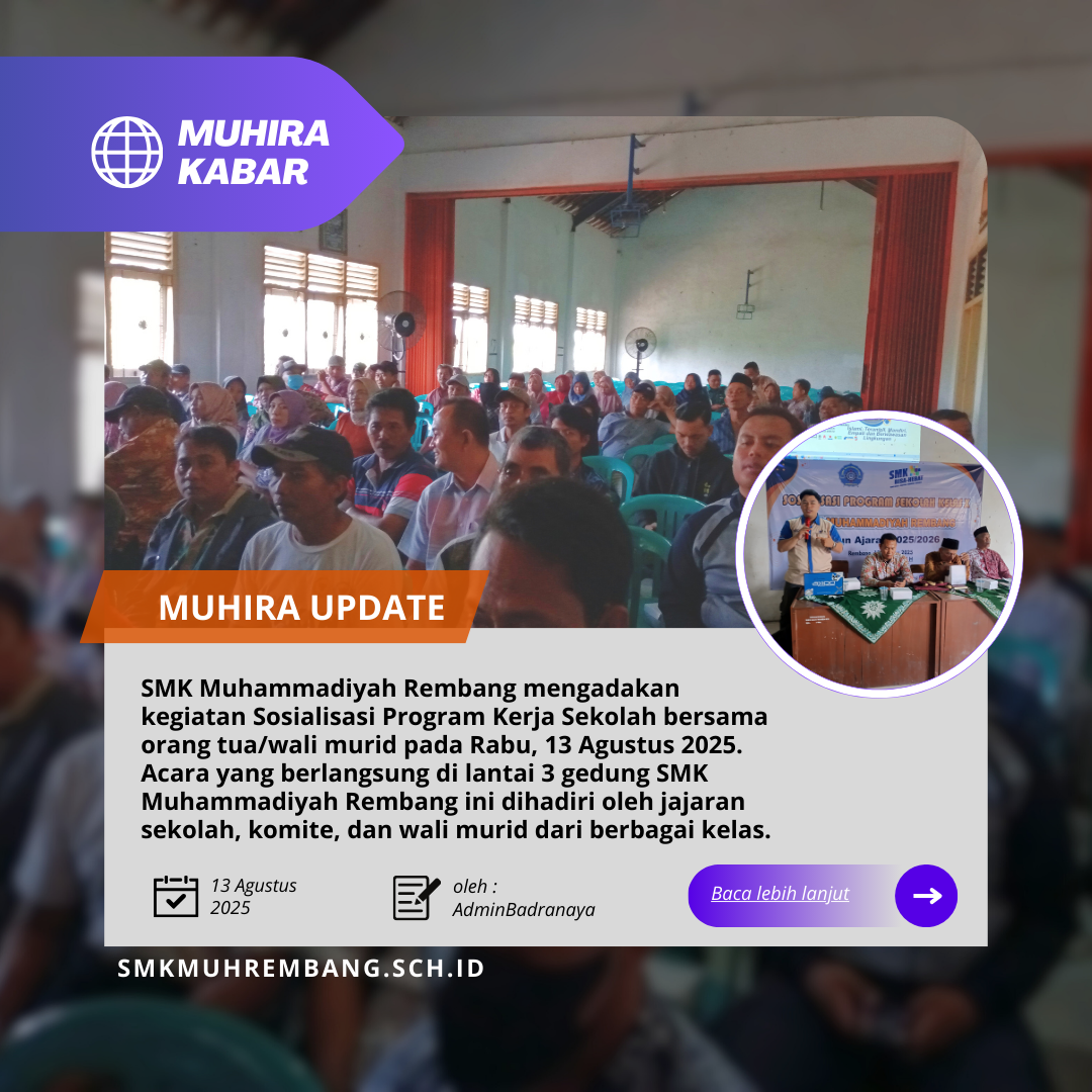 Rembang – SMK Muhammadiyah Rembang mengadakan kegiatan Sosialisasi Program Kerja Sekolah bersama orang tua/wali murid pada Rabu, 13 Agustus 2025...